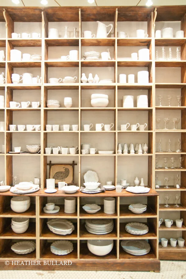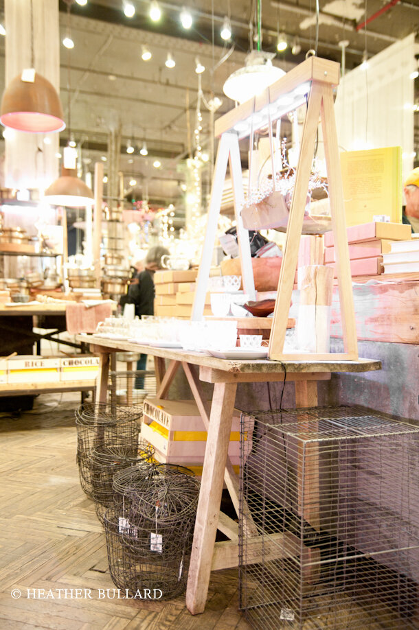 Their huge wall cubby filled with all white dishes was stunning in it's simplicity. And I noticed many of their display tables were made out of scaffolding and saw horses. I think the mix of worn, vintage elements with the newer items makes their displays interesting and unique.