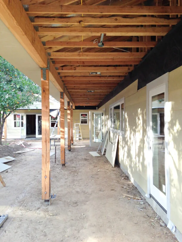 This is the back porch that connects to my studio. We chose 12" smooth cement siding to give the house a clean, modern line and had the porch eaves and ceilings boxed in with cement boards. We're in a high fire zone (as is, nearly all of California) and could not have any exposed wood on the entire house.
