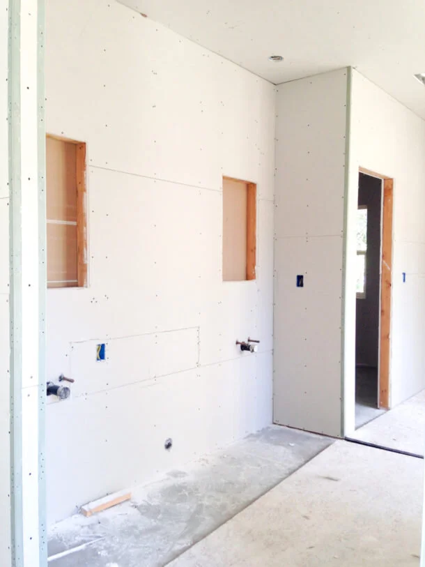 I designed a custom vanity for the master bathroom that is being made out of salvaged wood. Can't wait to show it to you, along with a few other details in the works! The door to the right is the walk-in closet.