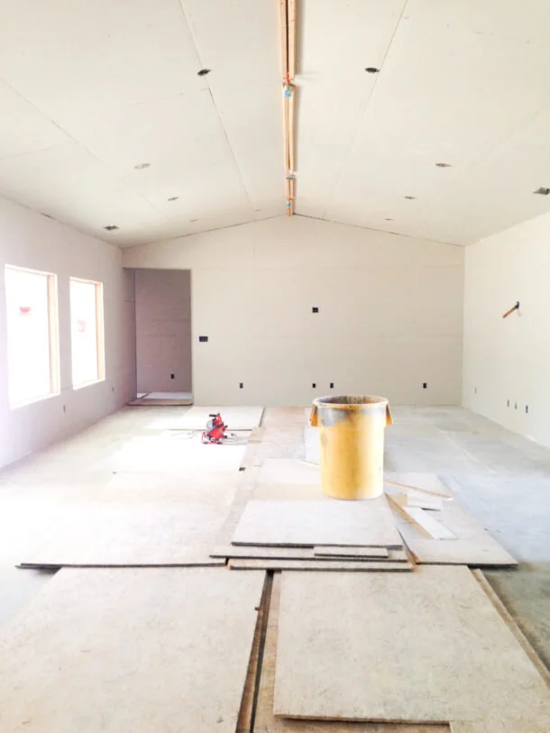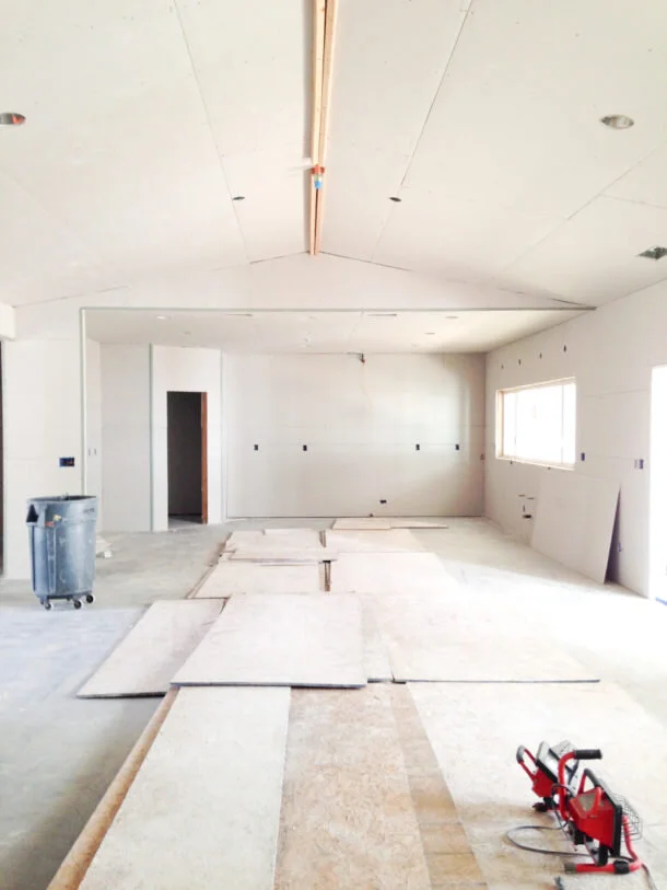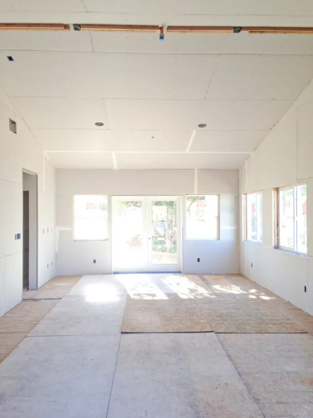 This is the great room and the hallway to the left leads to my studio. I love the enormous picture windows that will have a view to the gardens. The vaulted ceiling will have a reclaimed wood beam. We had the challenge of fire sprinkler heads needing to be right in the center of the room, thus the caps covering the sprinkler heads will be custom painted to match the beam.